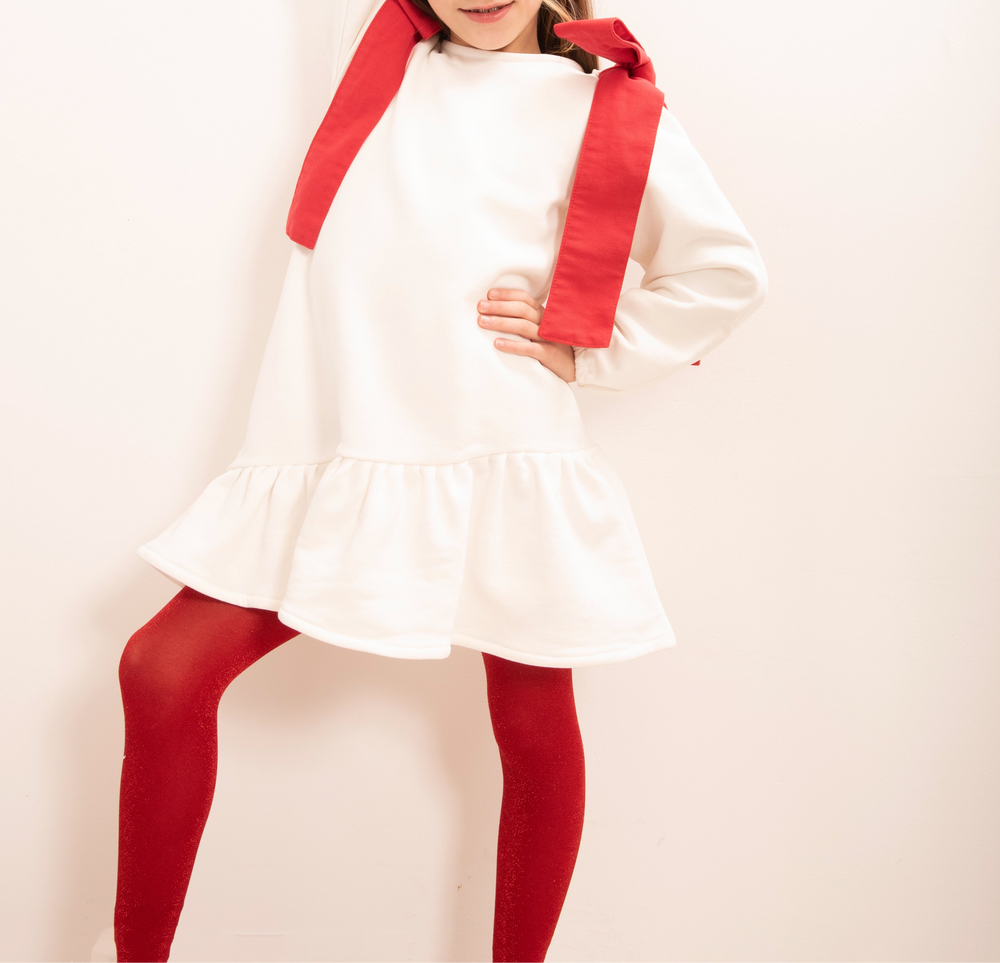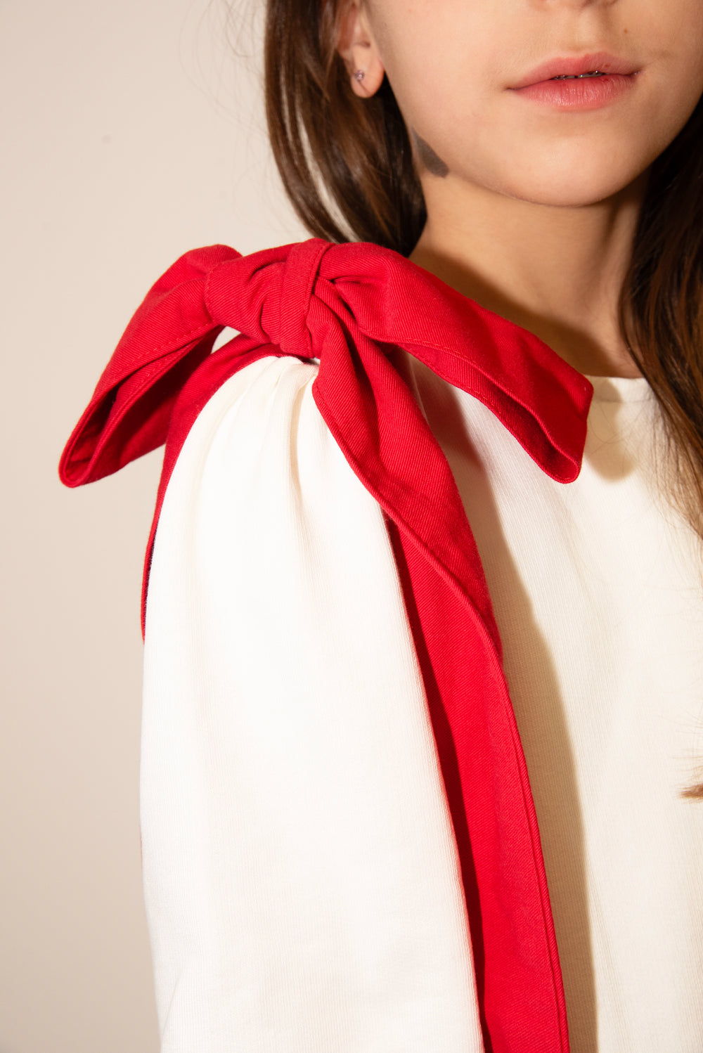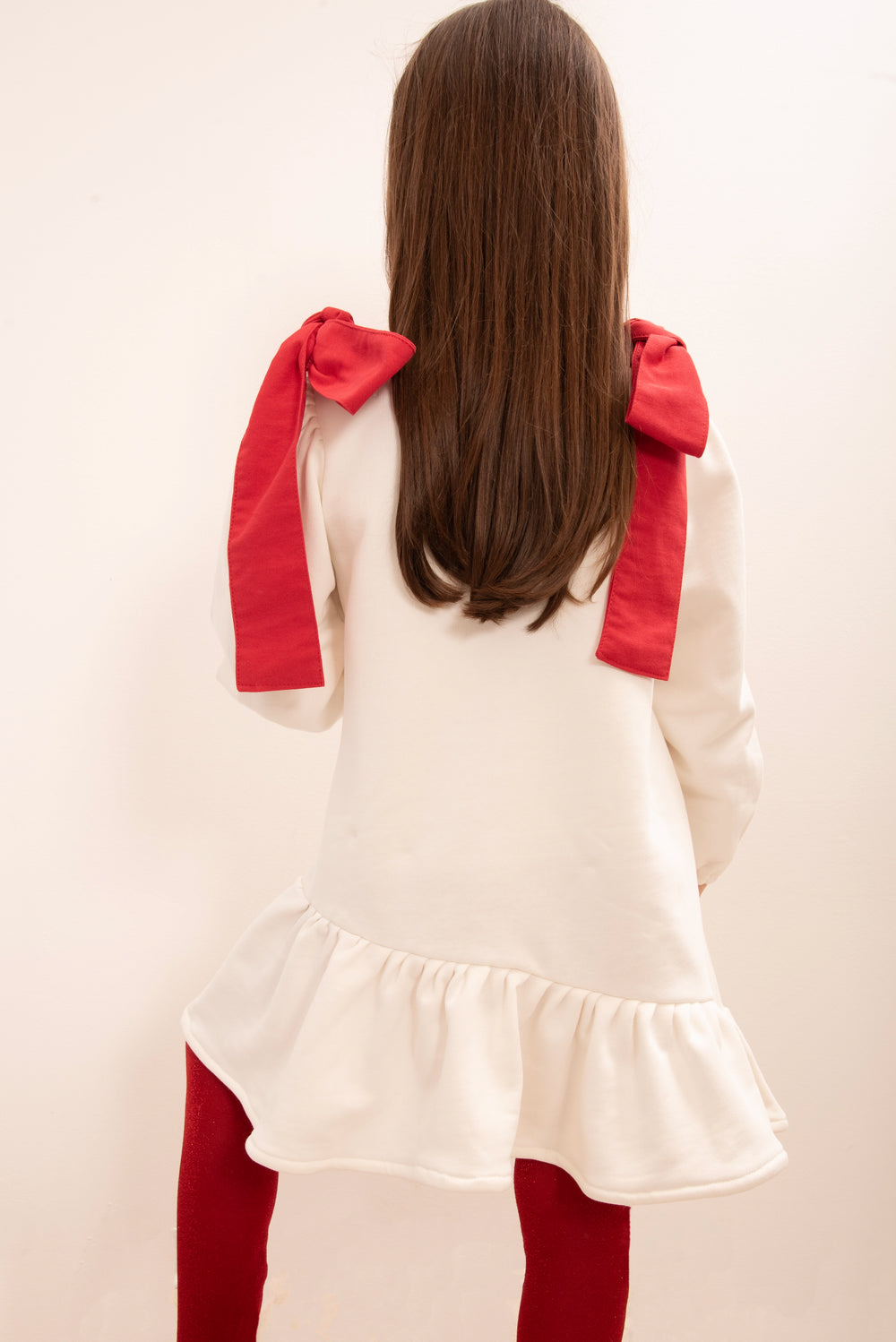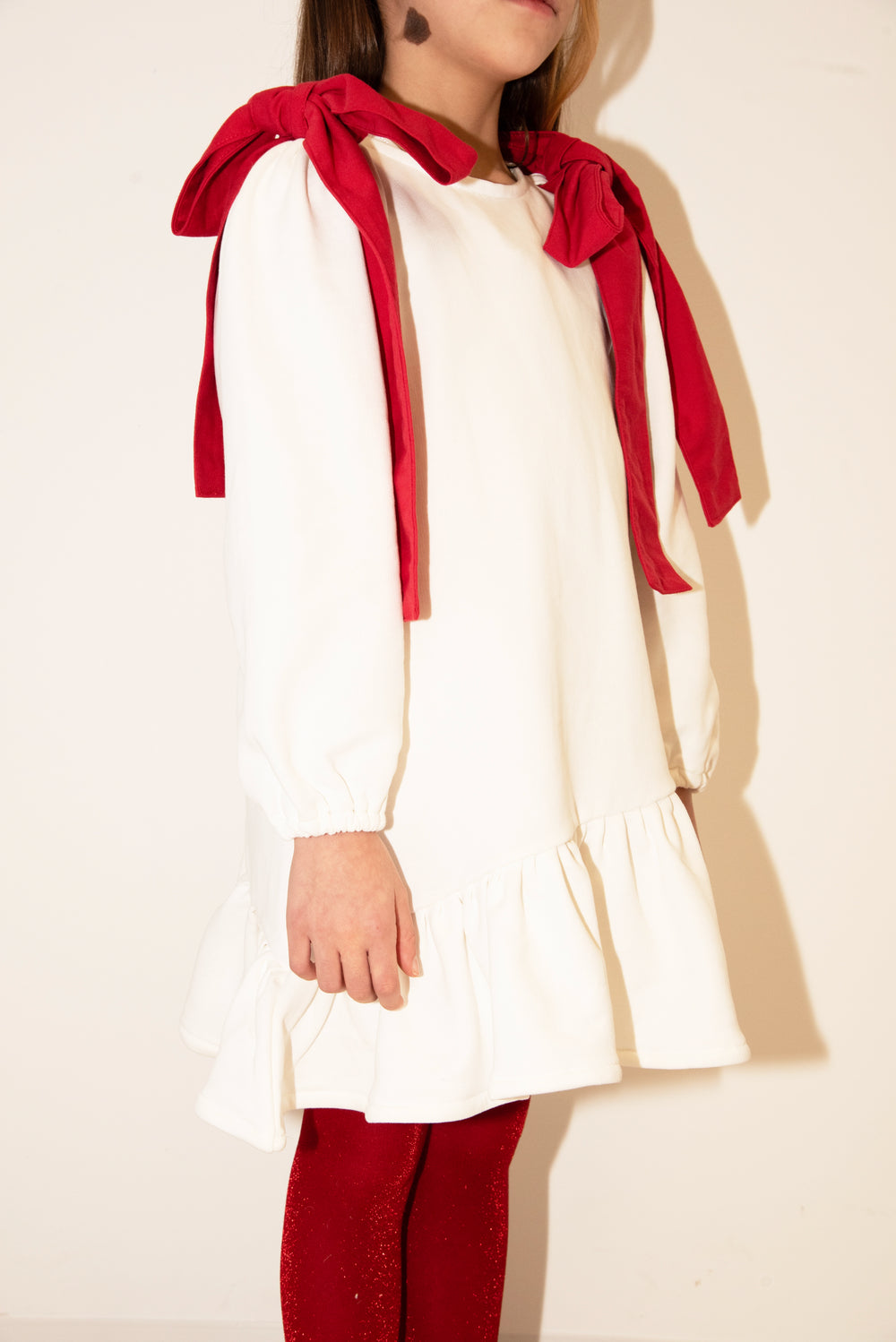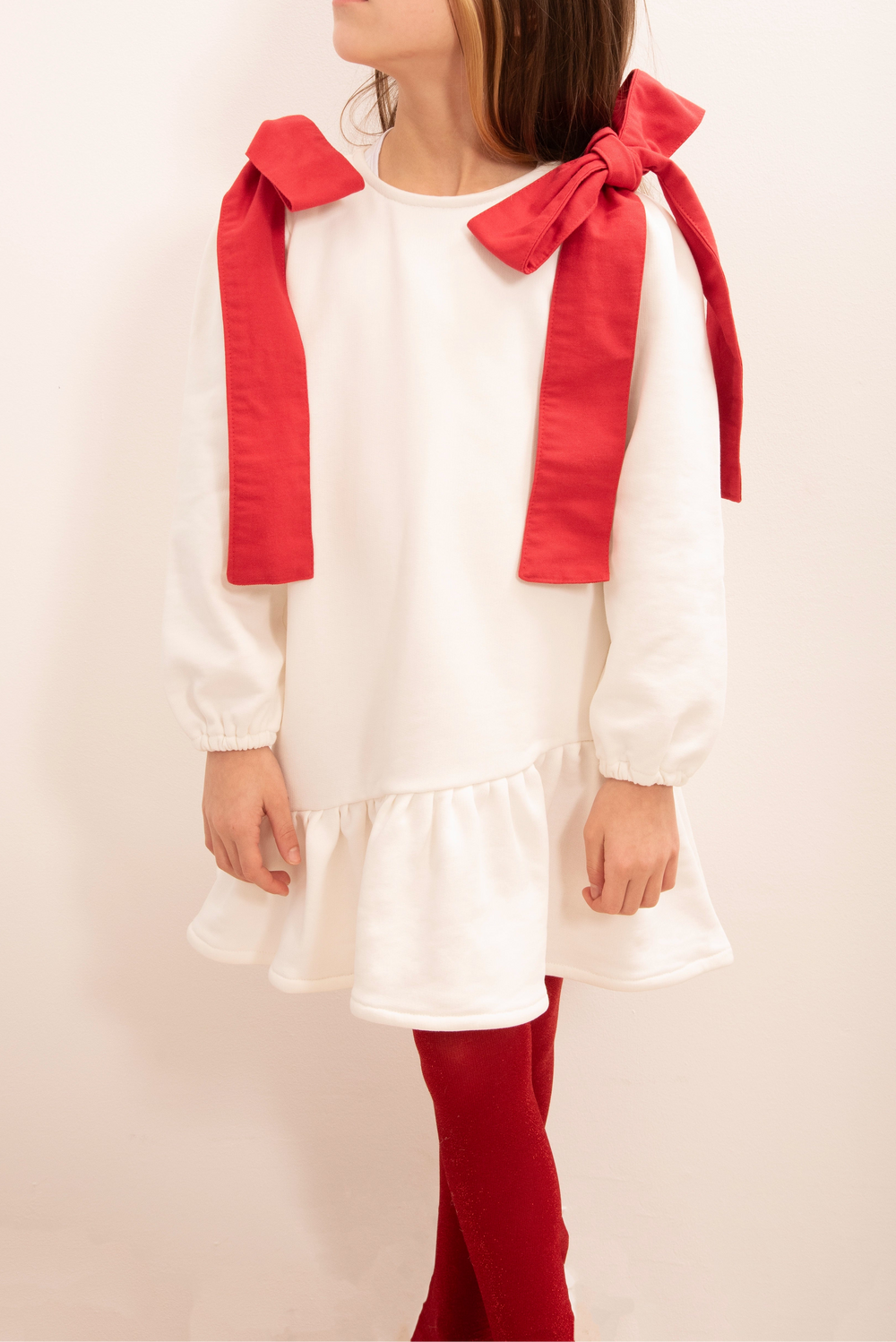 Abito bianco con grandi fiocchi rossi sul spalle. Voillant sul fondo e maniche ampie.