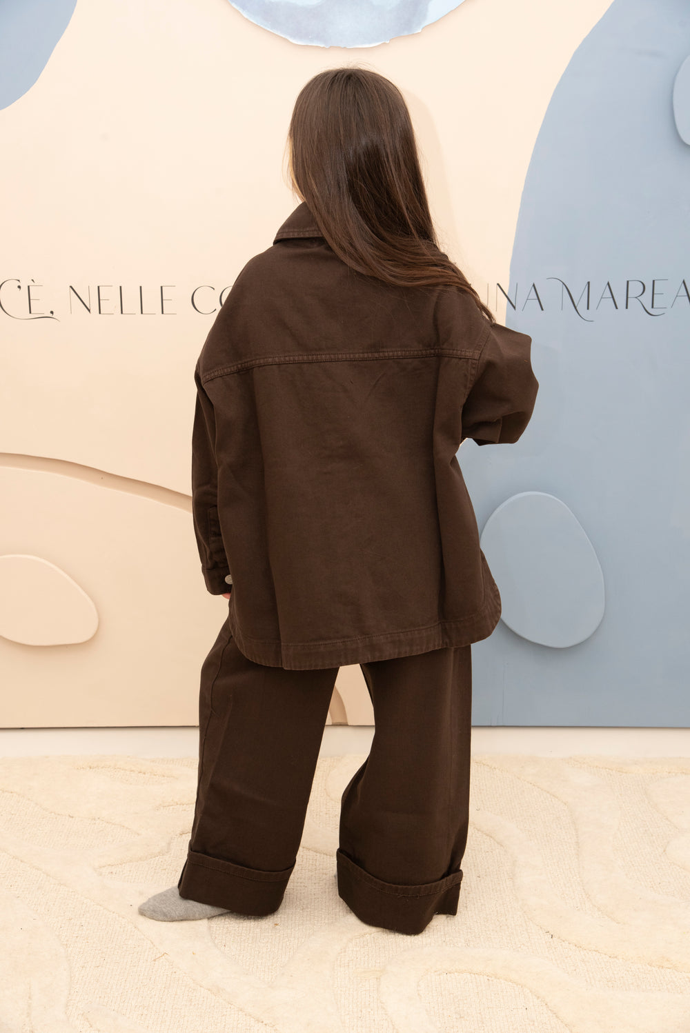 Set color cioccolato composto da giacca over e denim palazzo con risvolto