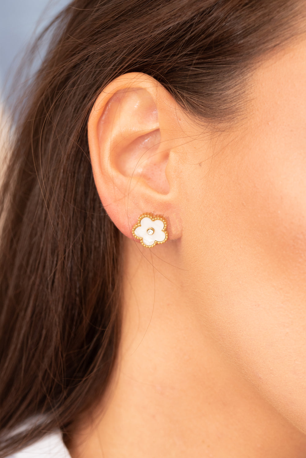 Orecchini al lobo con fiore bianco o nero e pietra al centro.