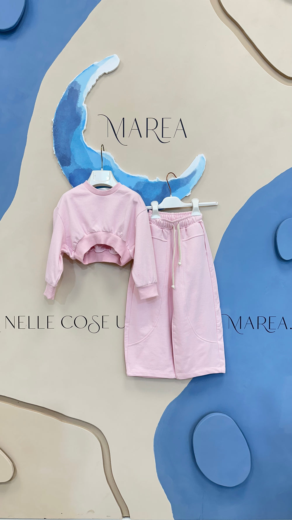 Set coordinato in tuta rosa con felpa crop e pantalone palazzo.
