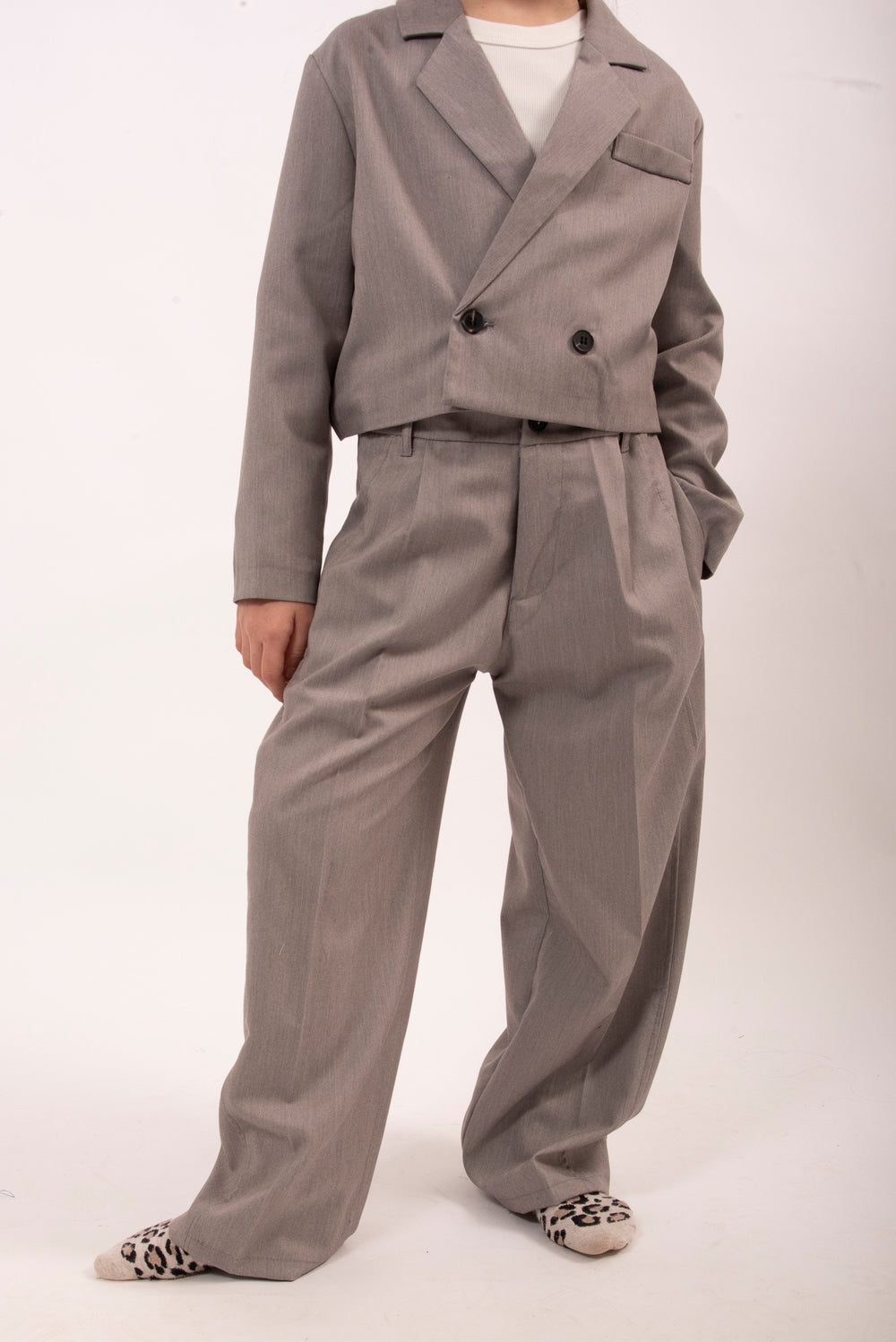 Tailleur bambina giacca crop doppio petto e pantalone palazzo.