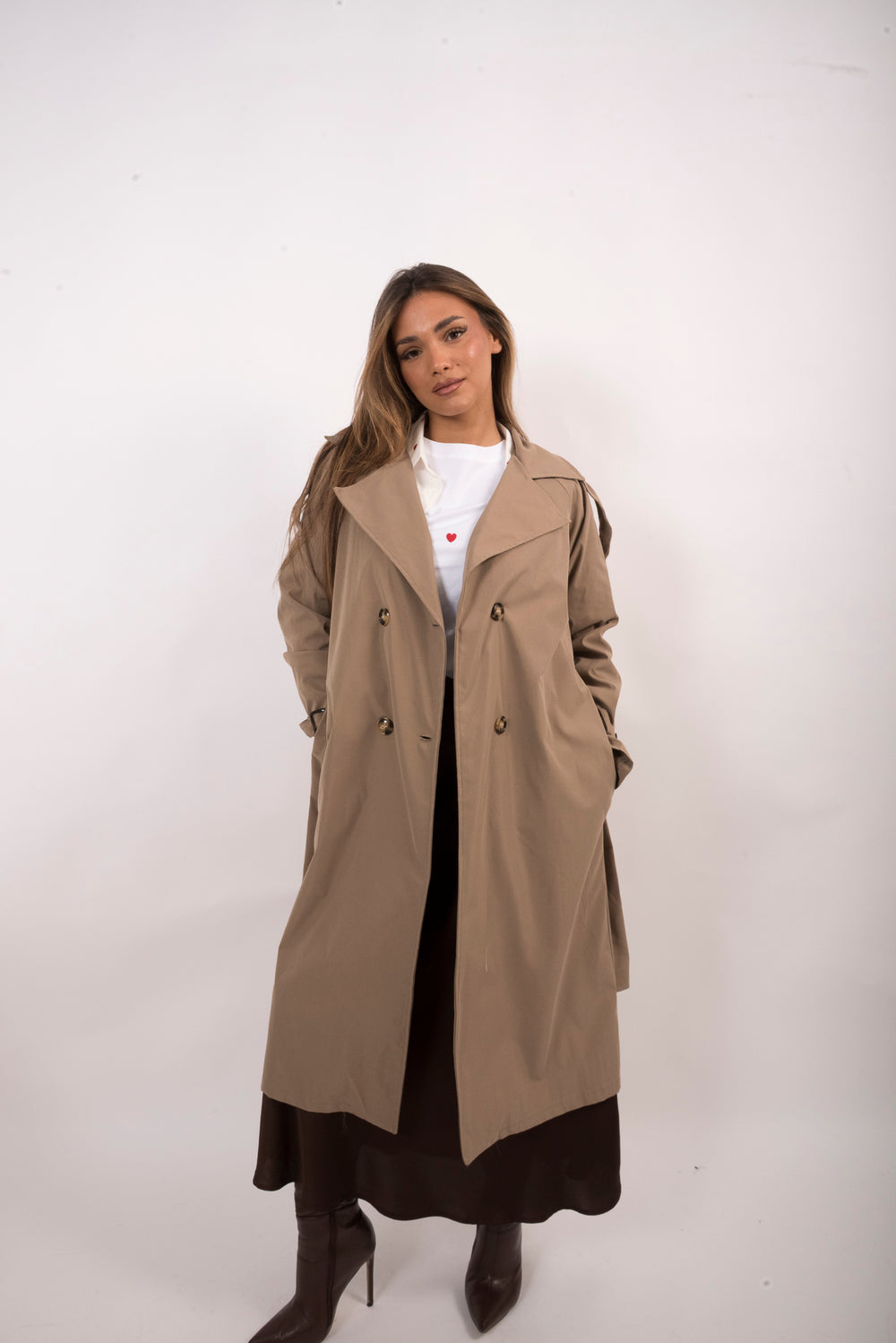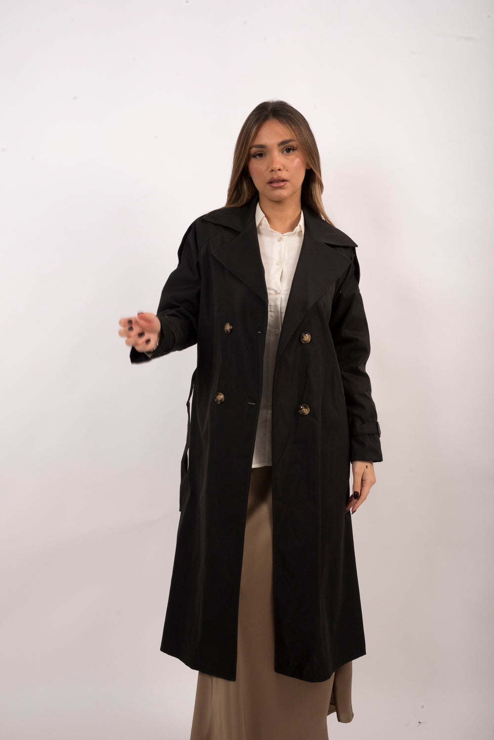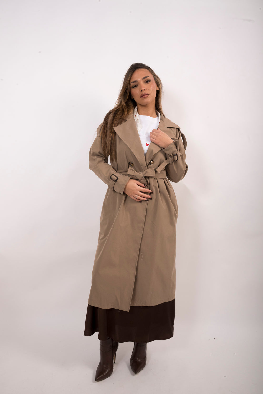 Trench lungo con tasche e cintura sulla vita e sui polsini.